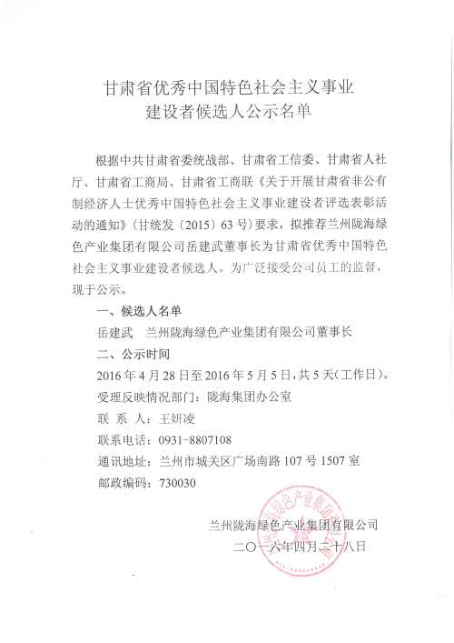 關于會長岳建武同志為甘肅省優秀中國特色社會主義事業建設者候選人的公示