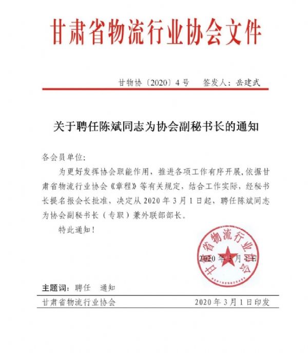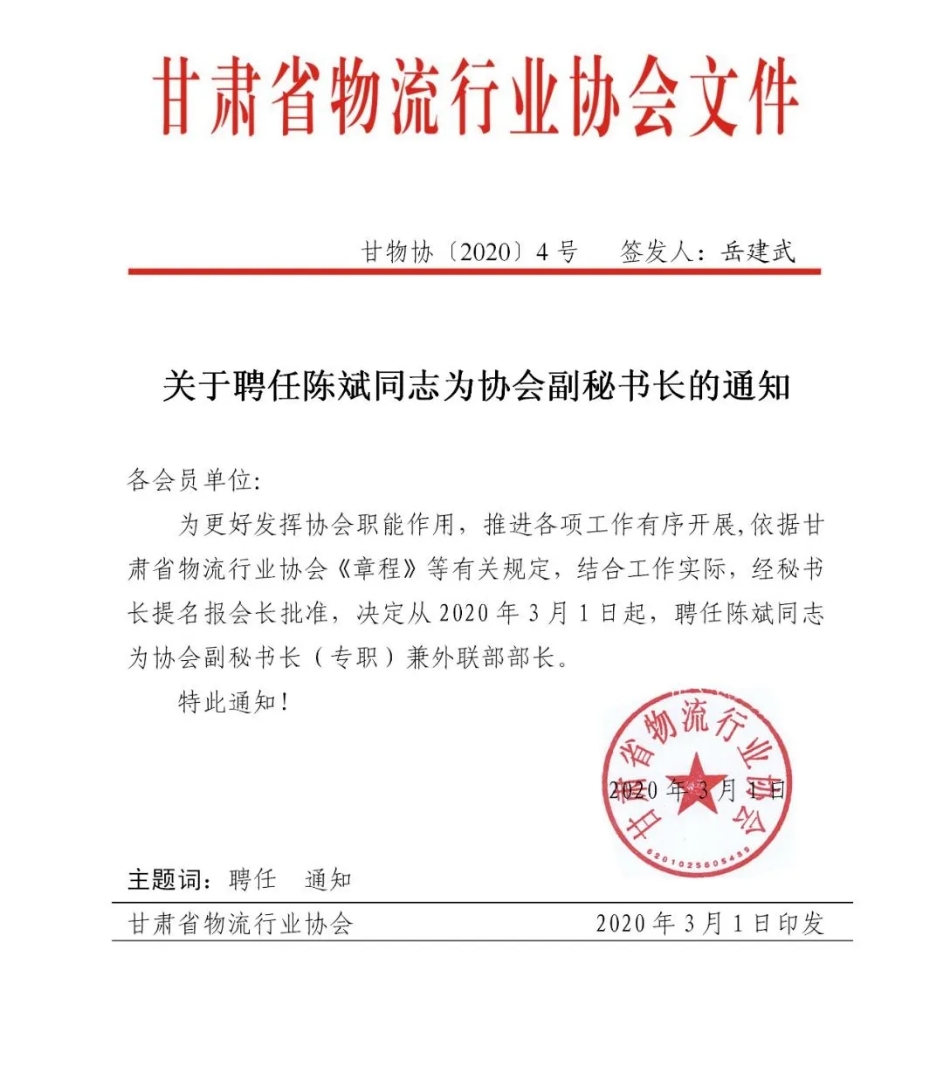 關(guān)于聘任陳斌同志為協(xié)會副秘書長的通知